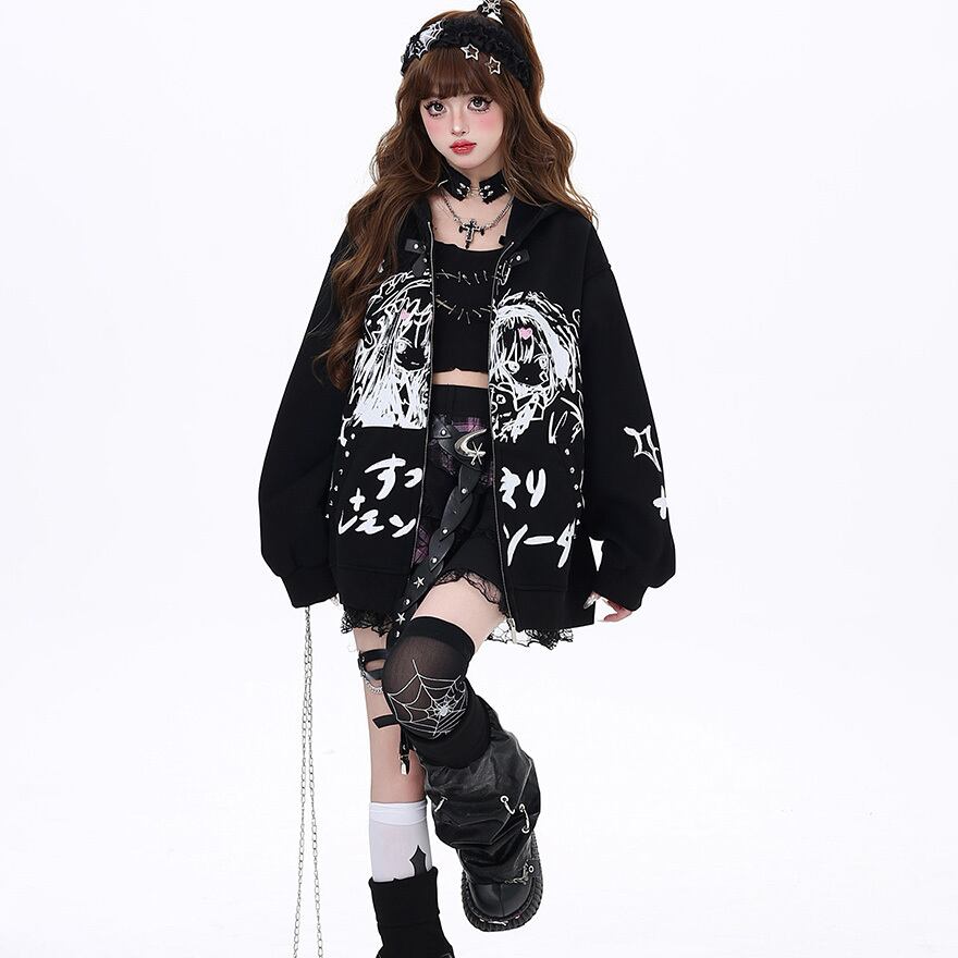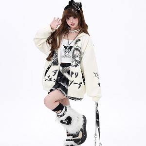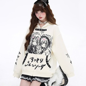 サブカル 服 地雷系 通販 系女子 パーカー 長袖トップス ZIP 二次元イラスト フード付き レザーバックル CRAZYGIRL JKロリィタ 原宿スタイル 系