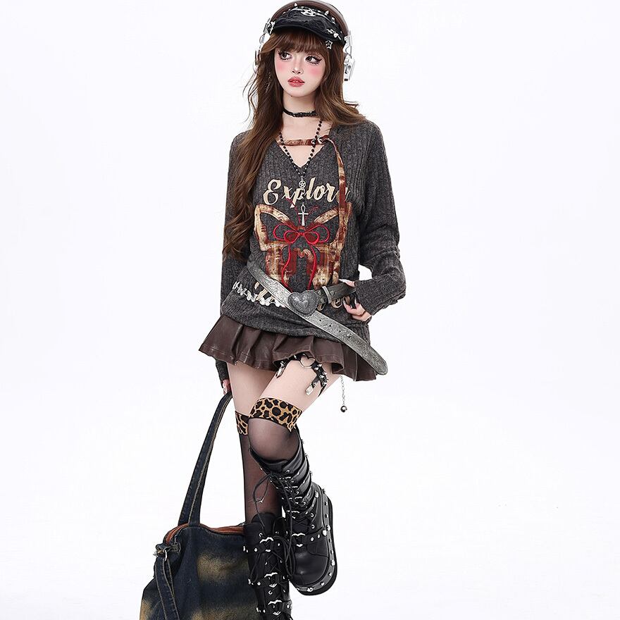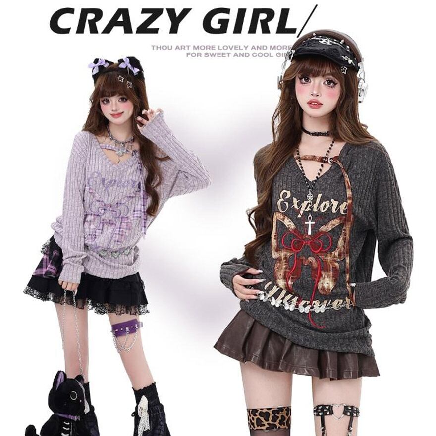 サブカル 服 地雷系 通販 パンク 系女子 長袖ブラウス プルオーバー Vネック 蝶刺繍 CRAZYGIRL JKロリィタ 原宿スタイルろりぃたふぁっしょん