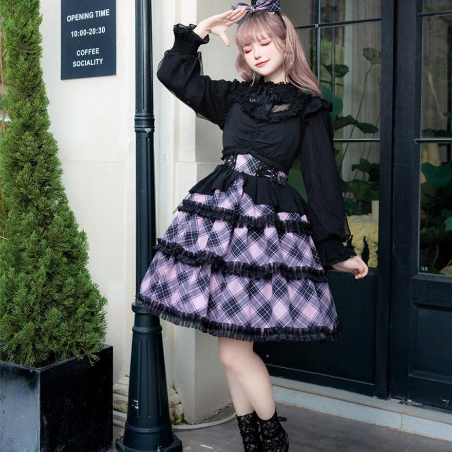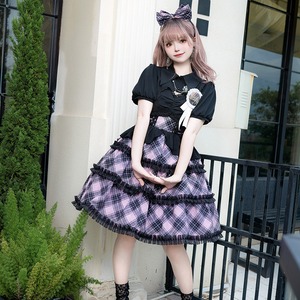 サブカル 服 地雷系 通販 セットアップ チェック柄 フリル ツーピース パフスリーブ 半袖 クラロリ ロリィタ 服 ガーリー