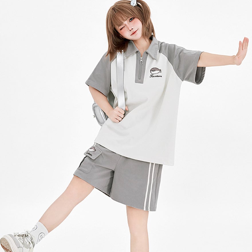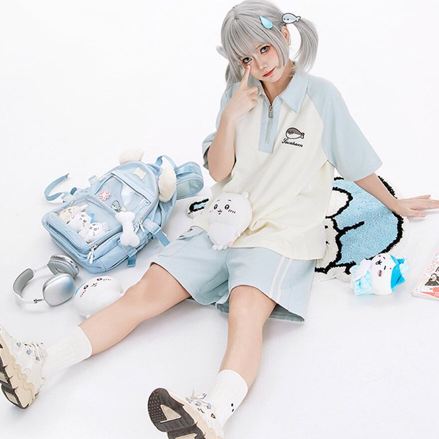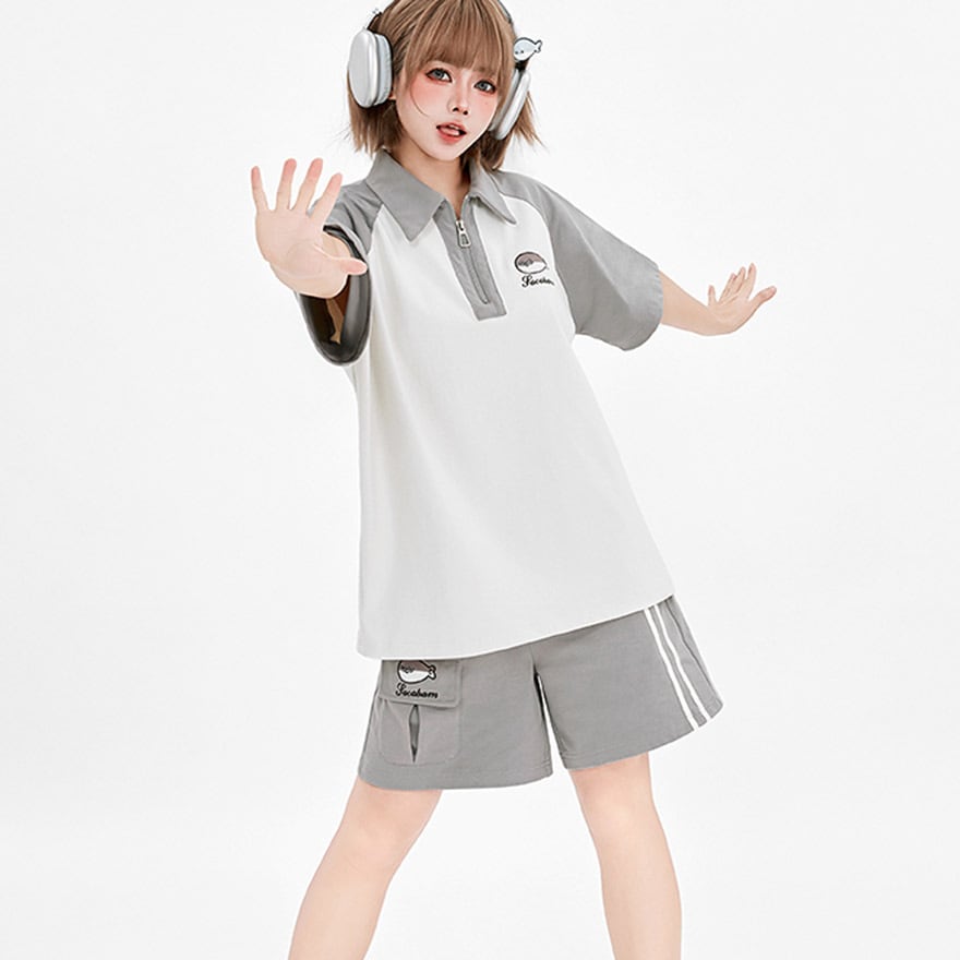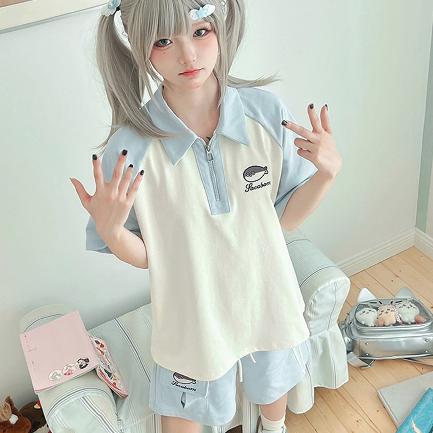 サブカル 服 地雷系 通販 半袖トップス ショートパンツ ゆるキャラ刺繍 ポロネック セットアップ ゆめかわふぁっしょん パステルカラー ガーリー ベビードール 量産型