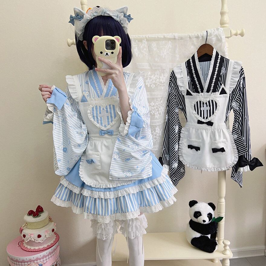 和装テイストのメイド服です。ストライプ柄とイラストプリントが可愛い。