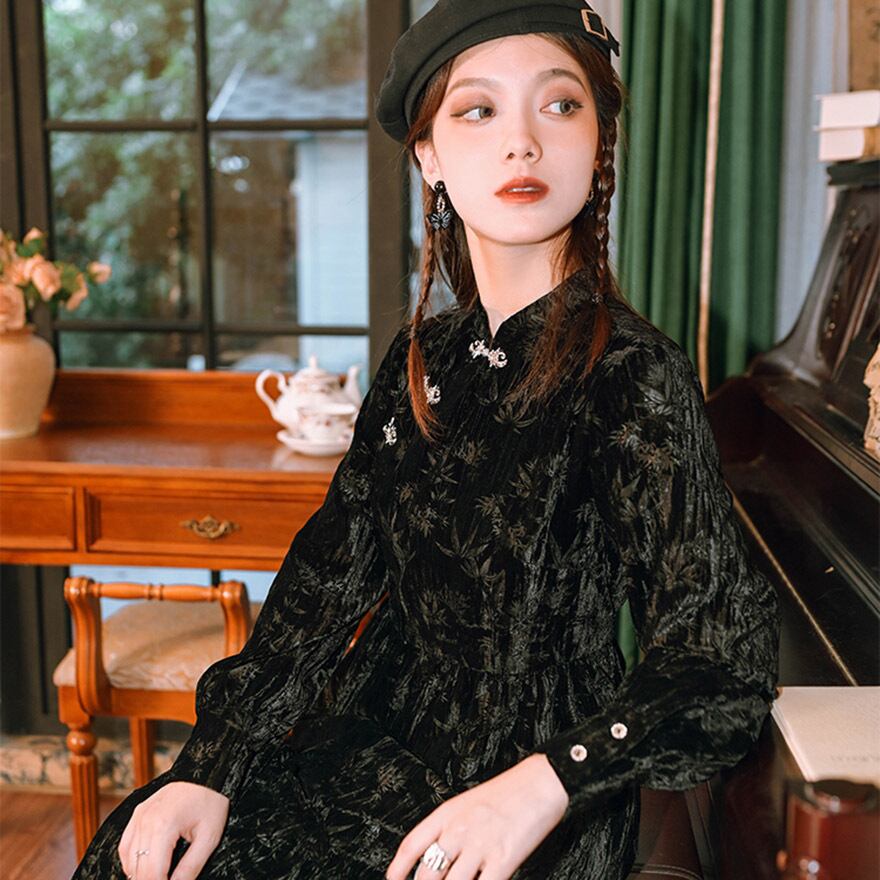 サブカル 服 地雷系 通販 チャイナ風服 古怪舎 スカート チャイナ服 ロングワンピース Aライン ベルベット バンブー柄 長袖 エレガント 普段着使い 闇かわいい ファッション