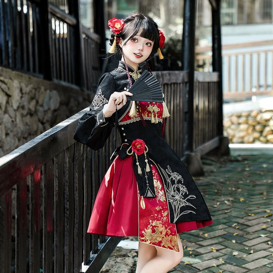 地雷系フリル&リボン: 袖口や裾にたっぷりとあしらわれたレースとフリルが、ハードになりがちなチャイナ服に「病み可愛い」甘さをプラス。専門店らしい絶妙なバランスを実現しています。