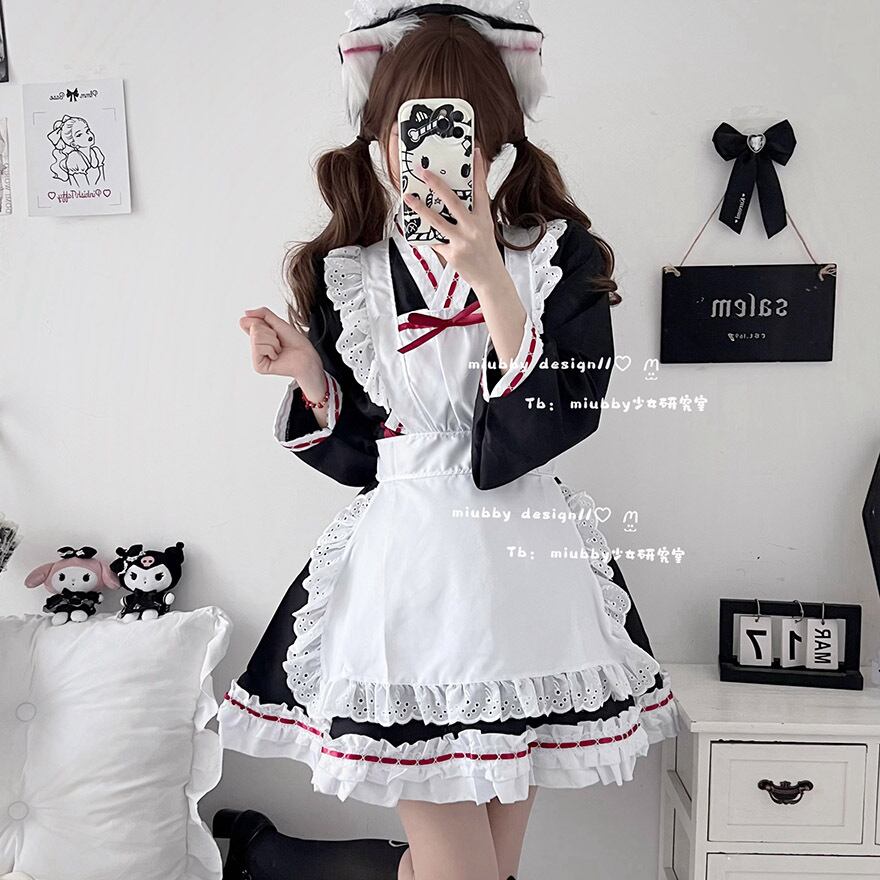 サブカル 服 地雷系 通販 和風メイド服 ワンピース フリル メイドワンピ エプロン カチューシャ ベビードール 量産型 原宿スタイル ロマンティック lolita