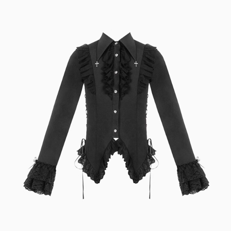 襟の十字架と、袖と裾のフリルレースが可愛いブラウスです。
