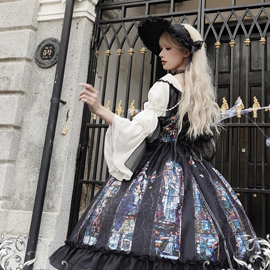 サブカル 服 地雷系 通販 クラロリ クラシカルワンピース 長袖 レース ハイウエスト ステンドグラス柄 エレガント レトロ 控えめ