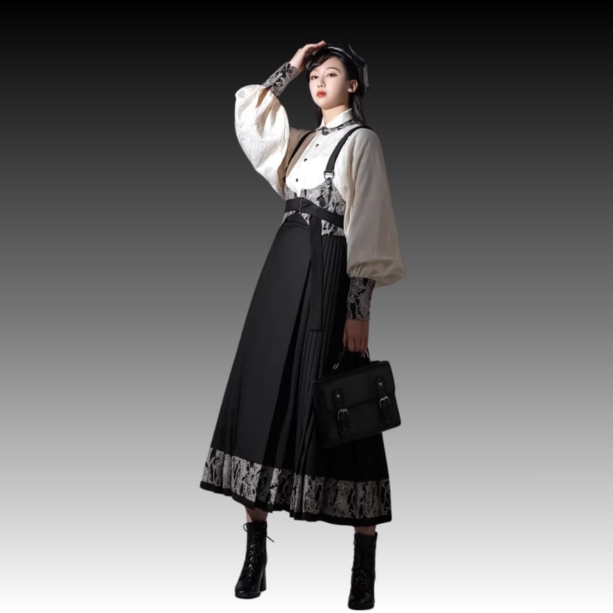 アウターはワイドなハーフスリーブのコート、トップスは花柄を襟、袖カラーにあしらい、ゆったりしたとろみ感が上品なバルーンスリーブデザイン、ハイウエストなスカートは可愛めなプリーツ巻きスカート、レトロなサスペンダーがおしゃれなビスチェの豪華4点セットとなります。