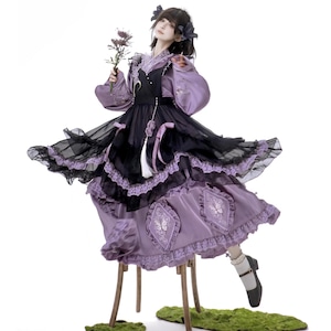 サブカル 服 地雷系 通販 メイドワンピ コンカフェ 着物 和装 胡蝶蘭 クラロリ パープル ワンピース エプロン メイドカフェ