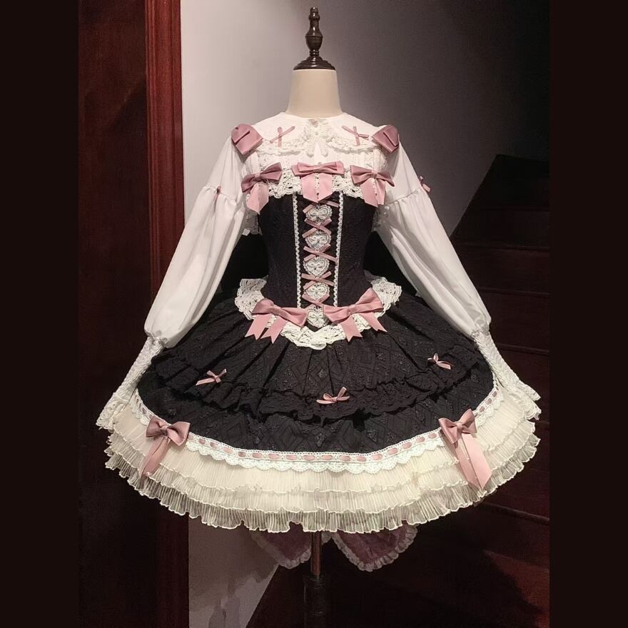 たっぷりフリルにレース、ピンクのリボンがおしゃれ増しなゴスロリ3点セットです。