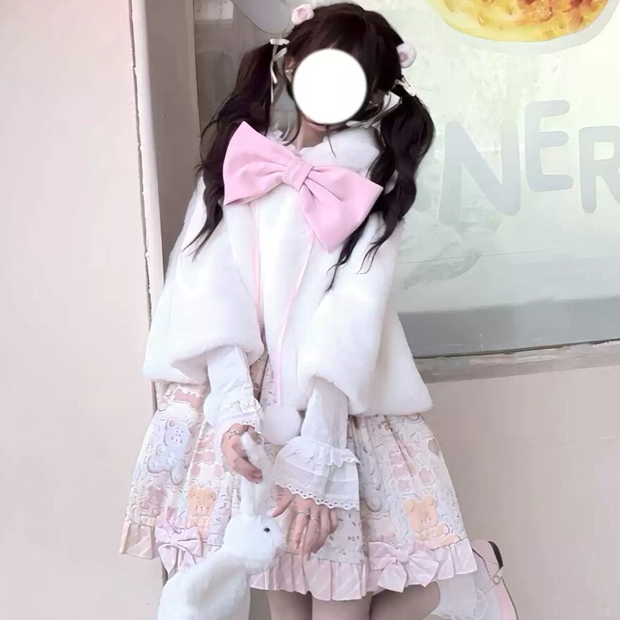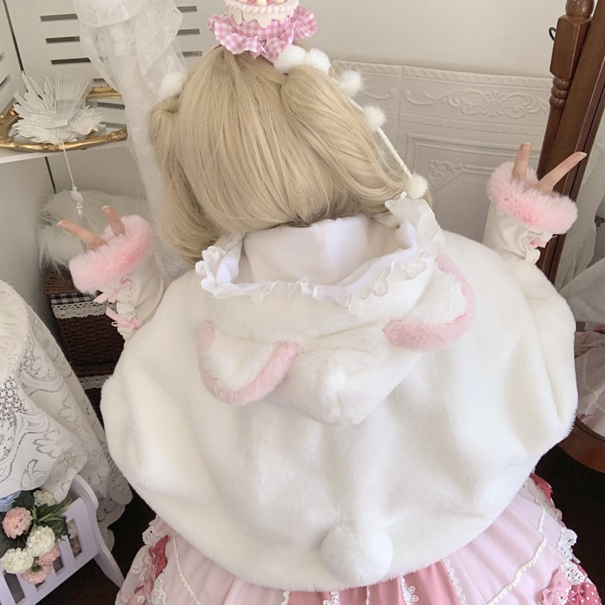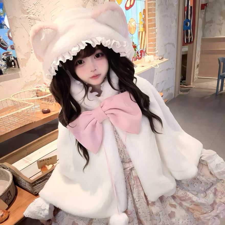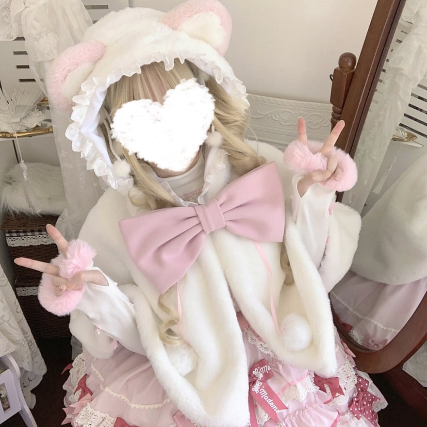 サブカル 服 地雷系 通販 ロリィタ 服 猫耳フード付きケープ コートふわふわ ハート ポンポン 暖か フェアリーテイル ロマンティック