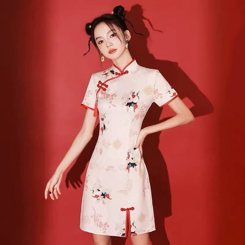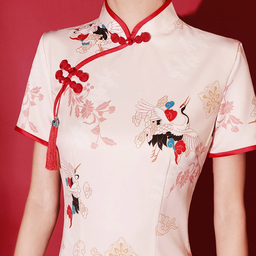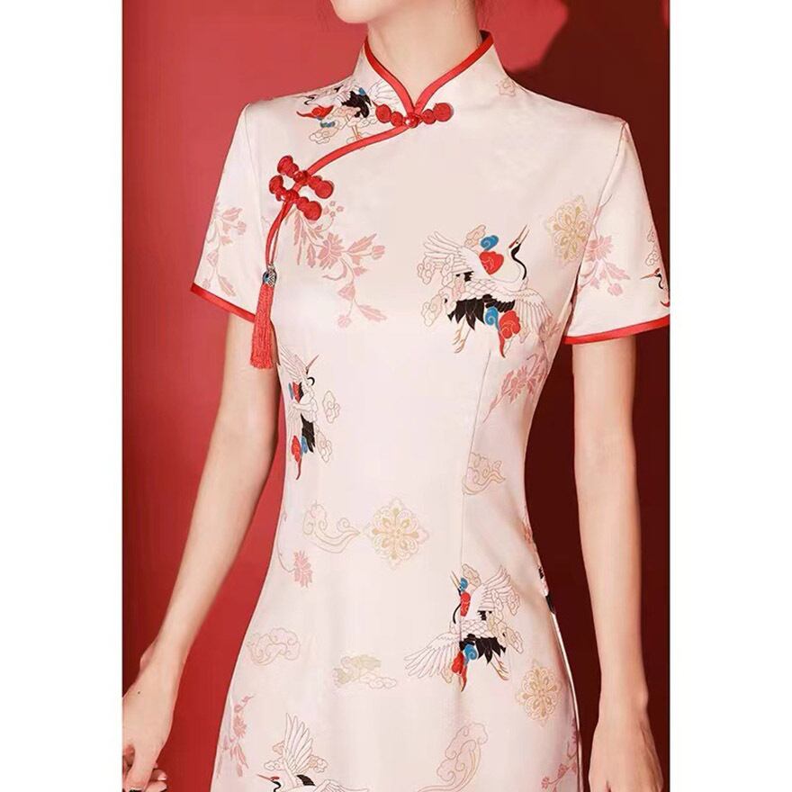 鶴柄がお洒落なサイドスリット入り、ピンクのチャイナドレスです。