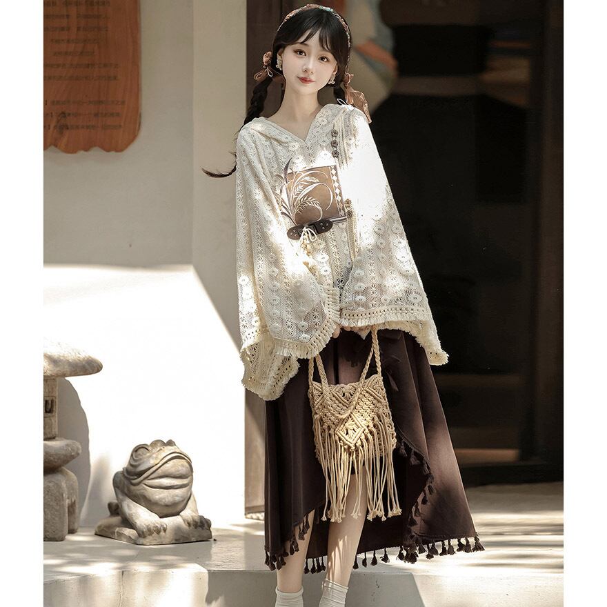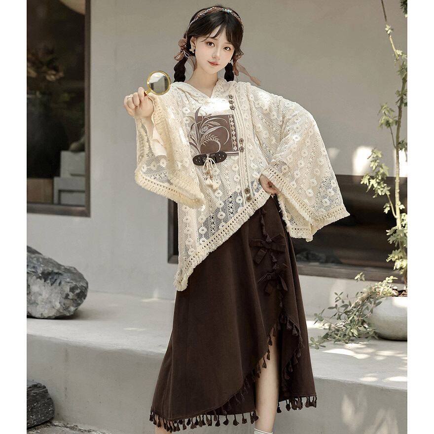 サブカル 服 地雷系 通販 中華ロリータ セットアップ トップス スカート レース フード付き タッセル アシンメトリー レトロ ダークファッション 原宿スタイル