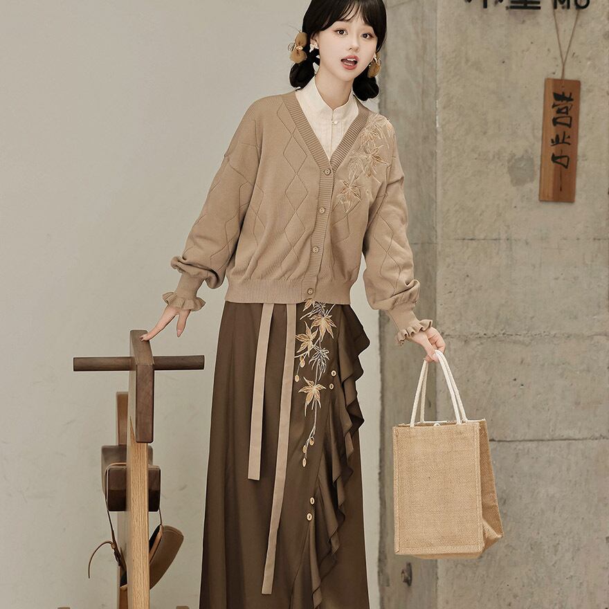 紅葉柄の刺繍が可愛いカーディガンと、シャツ、スカートの3点セットです。