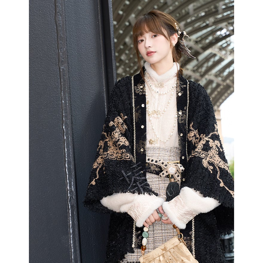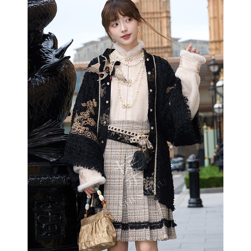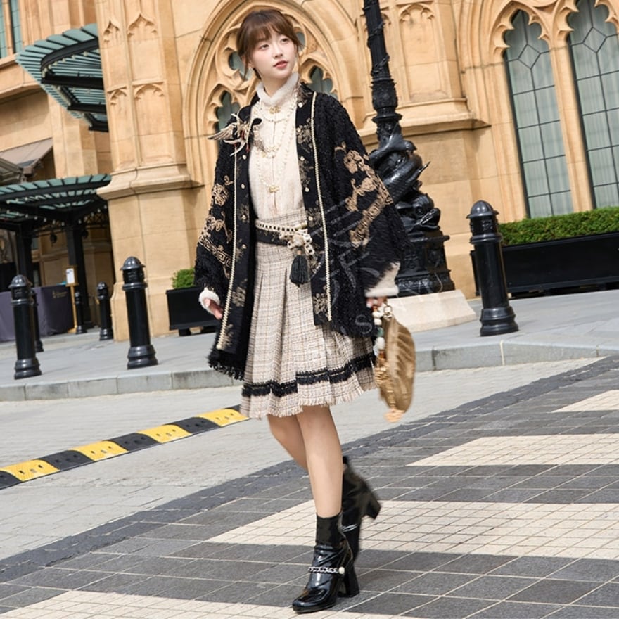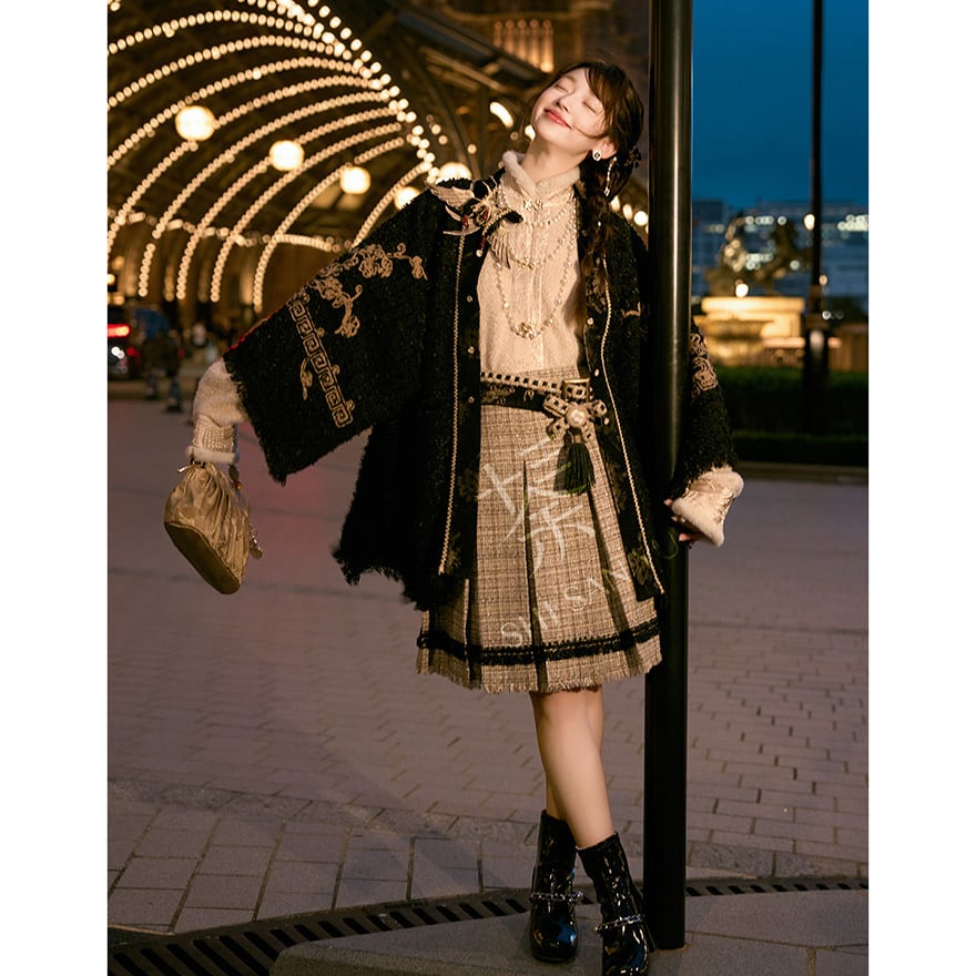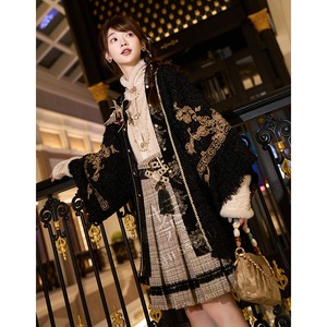 ゴールドの刺繍がお洒落な羽織りに厚手の秋服長袖シャツ、エスニックな民族調ミニスカートの3点セットアップです。