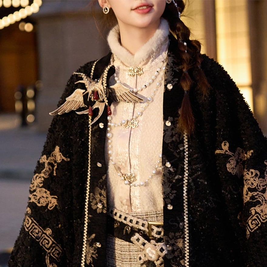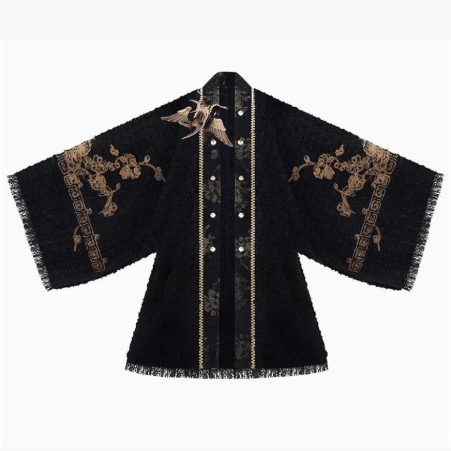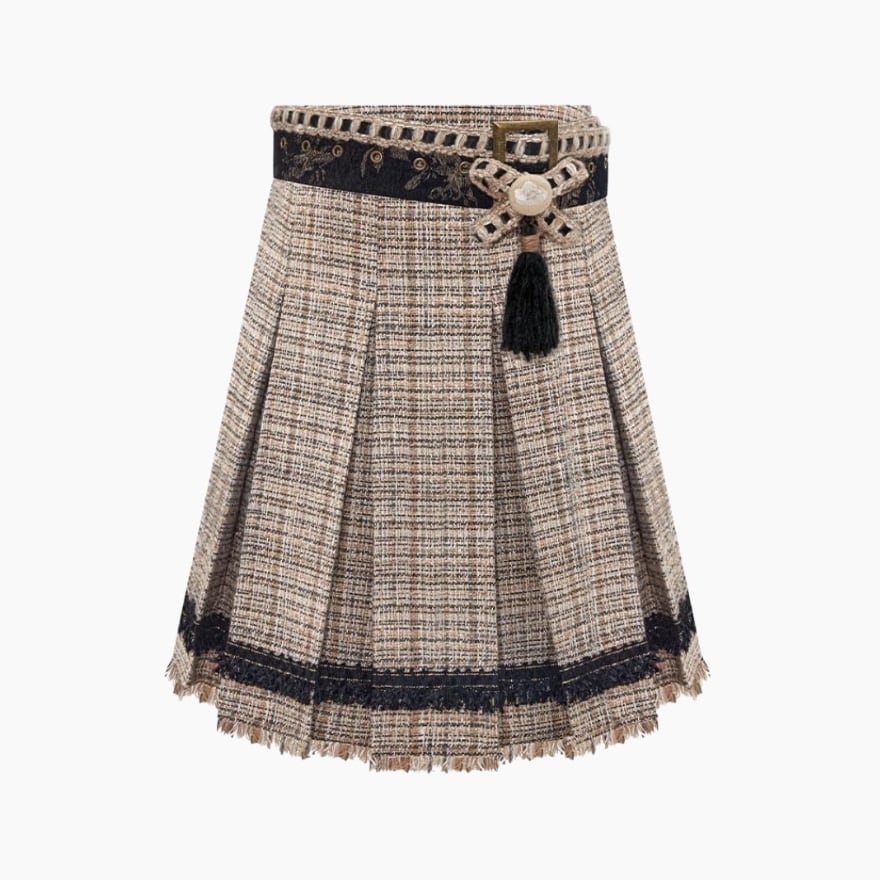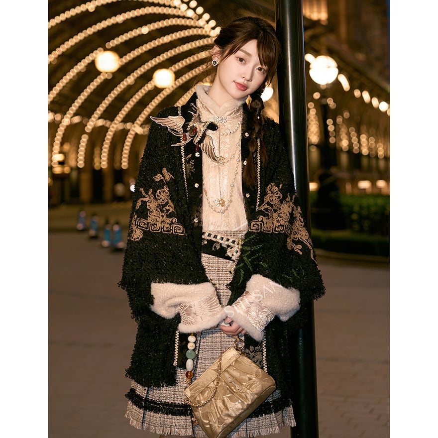 ゴールドの刺繍がお洒落な羽織りに厚手の秋服長袖シャツ、エスニックな民族調ミニスカートの3点セットアップです。