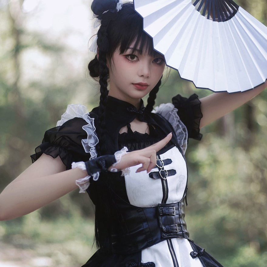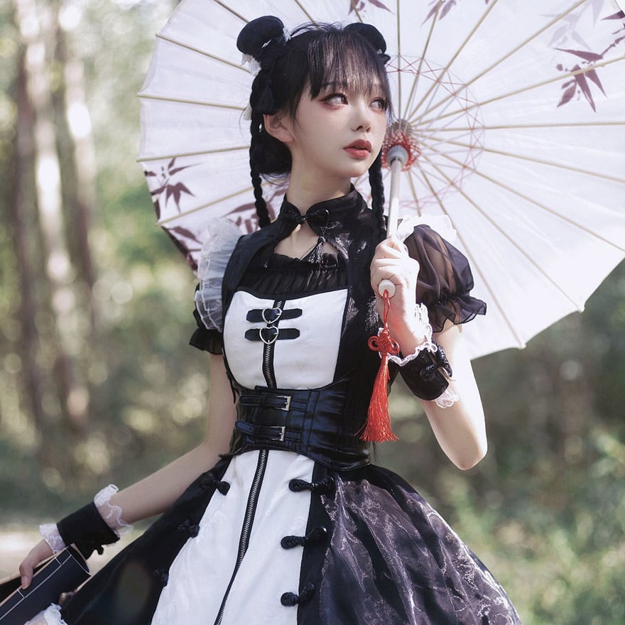双子コーデにもおすすめな白と黒のチャイナワンピースです。