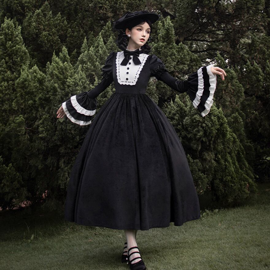 サブカル 服 地雷系 通販 納期30日 ワンピース 長袖 ロング丈 ドレス ベルベット 姫袖 ネックリボン ゴスロリ レトロ ダークファッション 闇かわいい