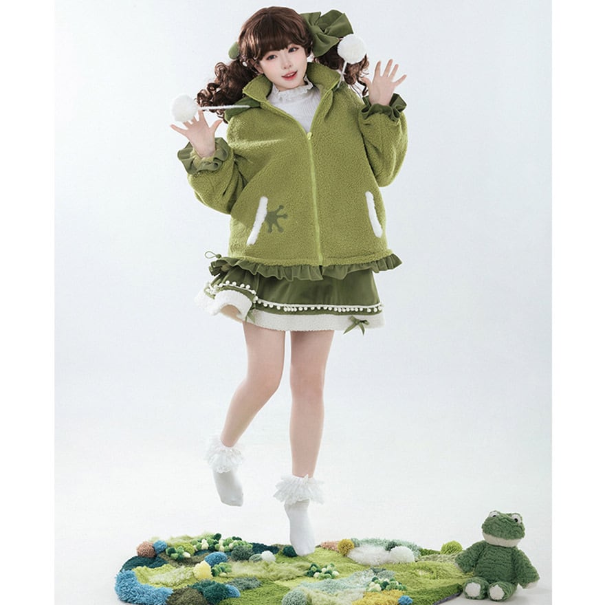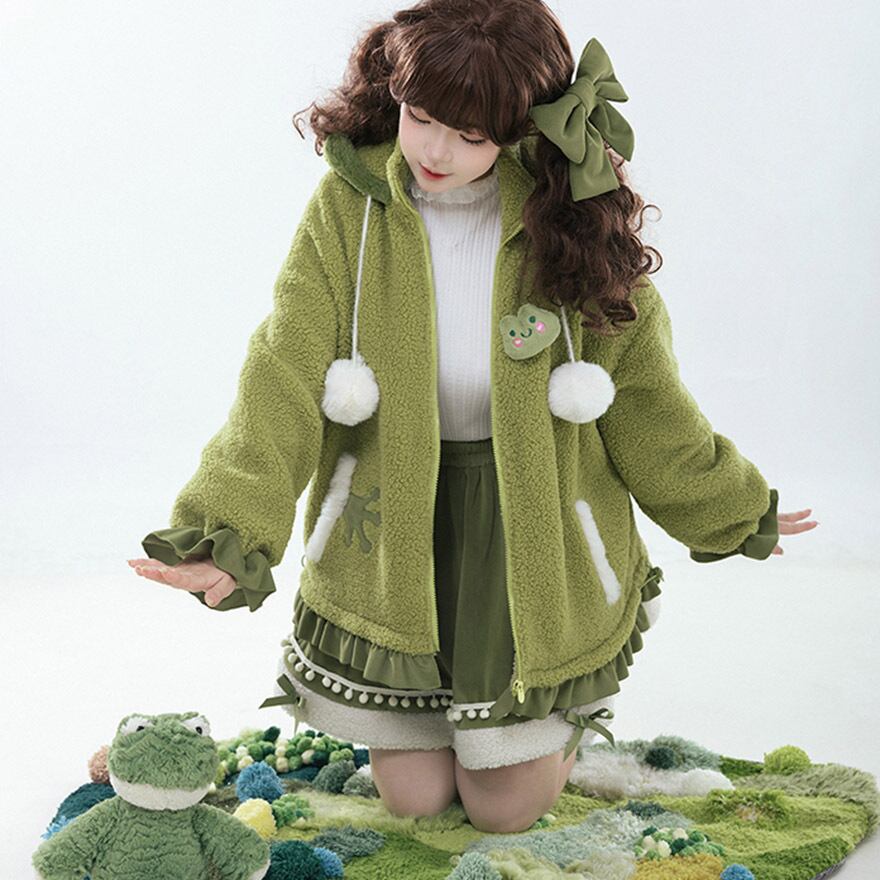 サブカル 服 地雷系 通販 系 ファッション PUJI オリジナル ジャケット パーカー フード付き ボア アウター カエル ぽんぽん 秋冬服 量産型 ガーリー