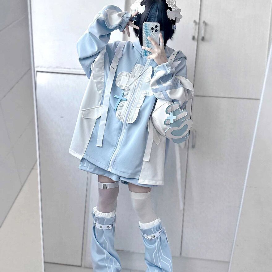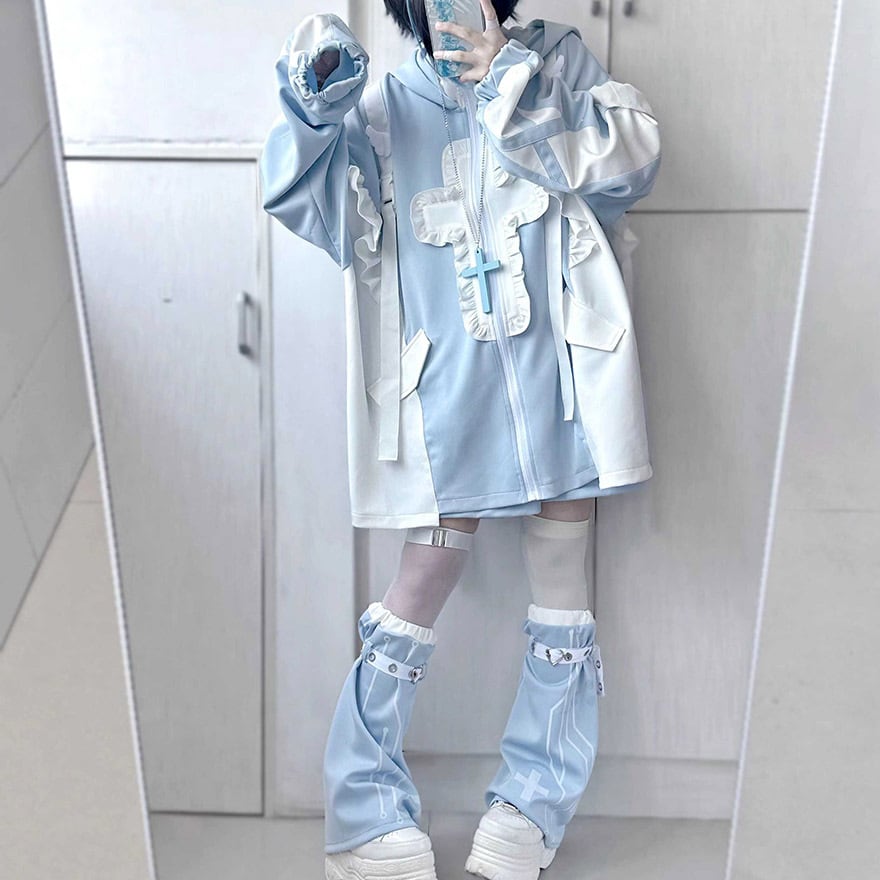 サブカル 服 地雷系 通販 セットアップ トップス ショートパンツ レッグカバー 猫耳フード ZIPパーカー 十字架 パステル 女子 秋冬服 量産型 ガーリー
