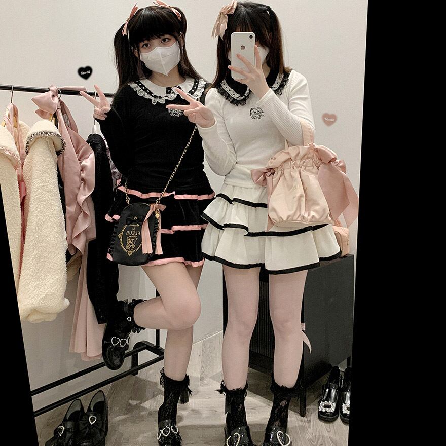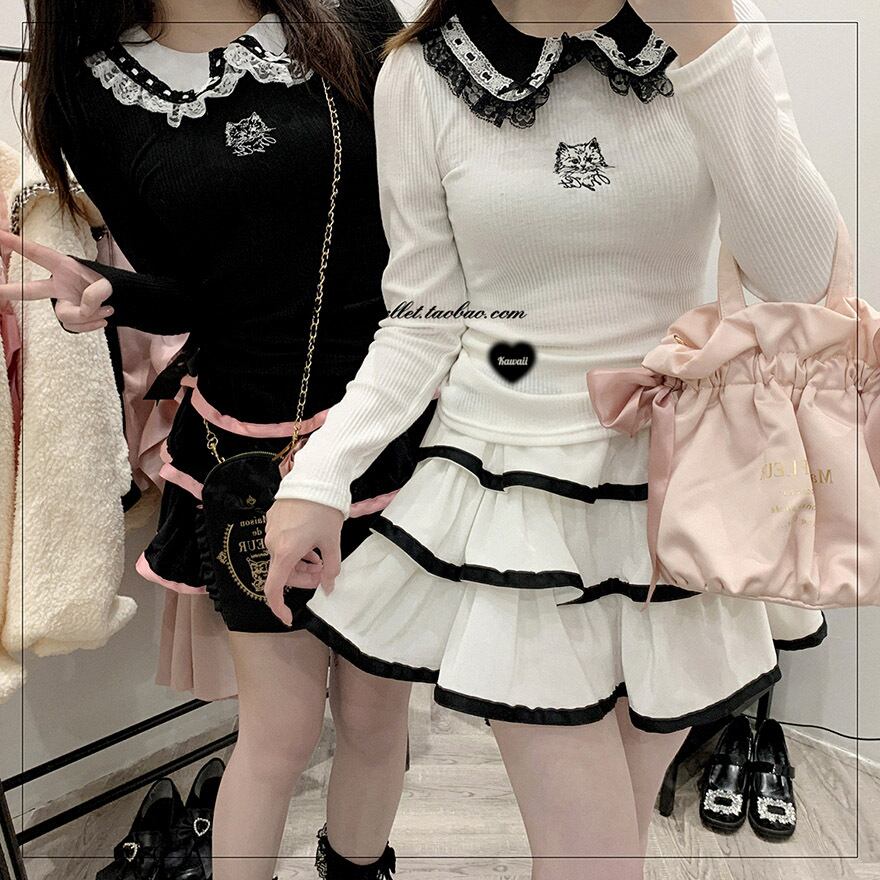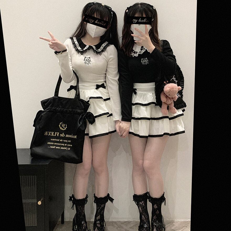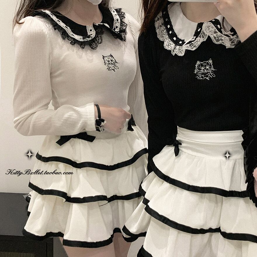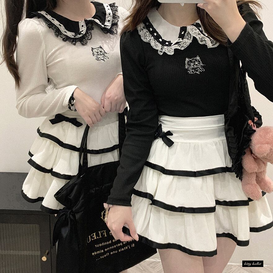 サブカル 服 地雷系 通販 長袖シャツ ニット プルオーバー 襟付き 猫刺繍 KittyBxllet レース リボン 秋冬服 量産型 ガーリー