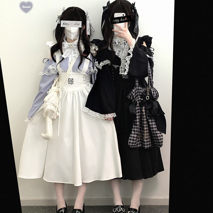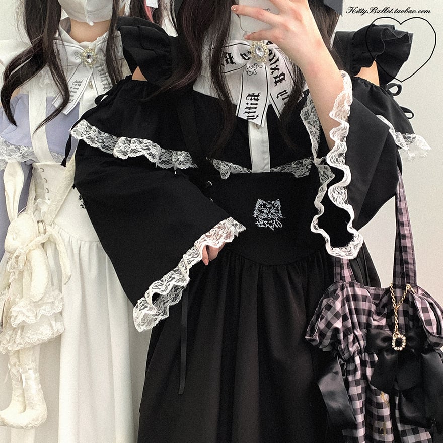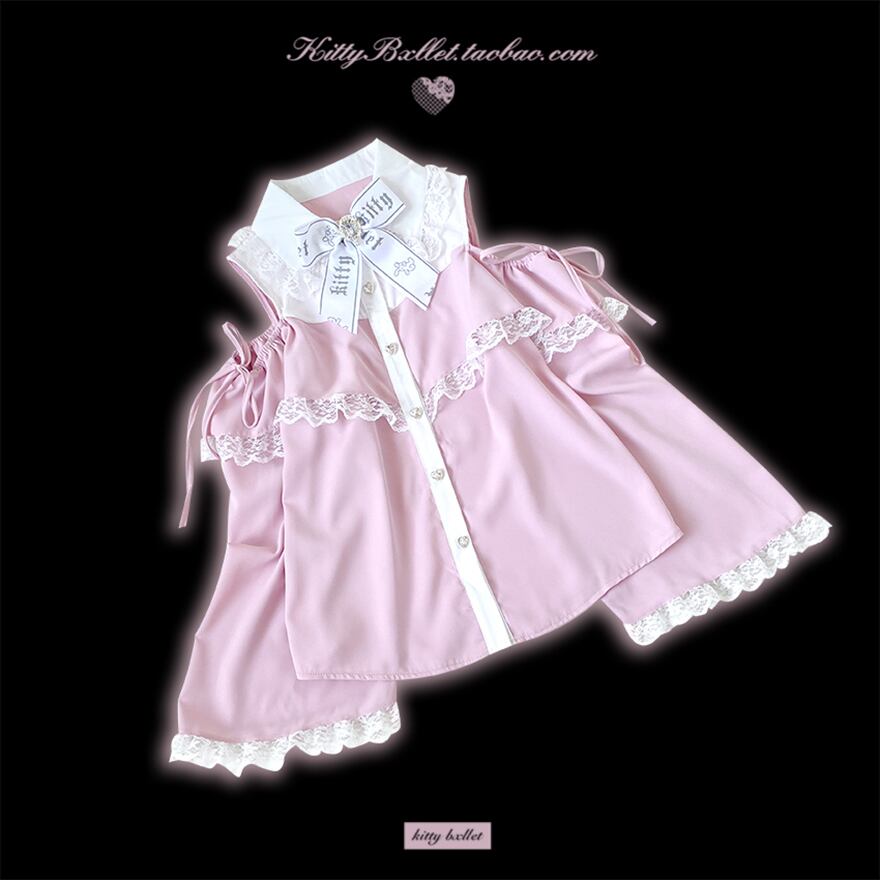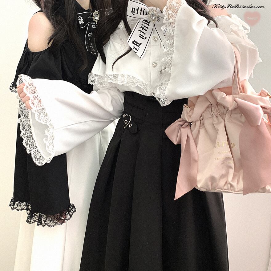 サブカル 服 地雷系 通販 長袖シャツ ブラウス オープンショルダー リボン レース 姫袖 フレアスリーブ KittyBxllet オフショル 秋冬服 量産型 ガーリー