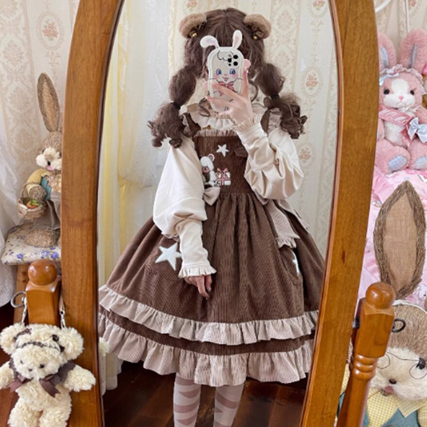 サブカル 服 地雷系 通販 ワンピース 長袖シャツ プルオーバー ジャンスカ 星 クマちゃん 刺繍 コーデュロイ 秋冬服 量産型 ベビードール ガーリー