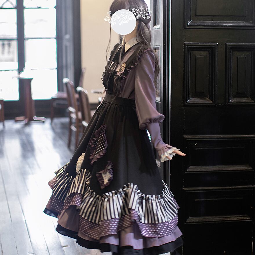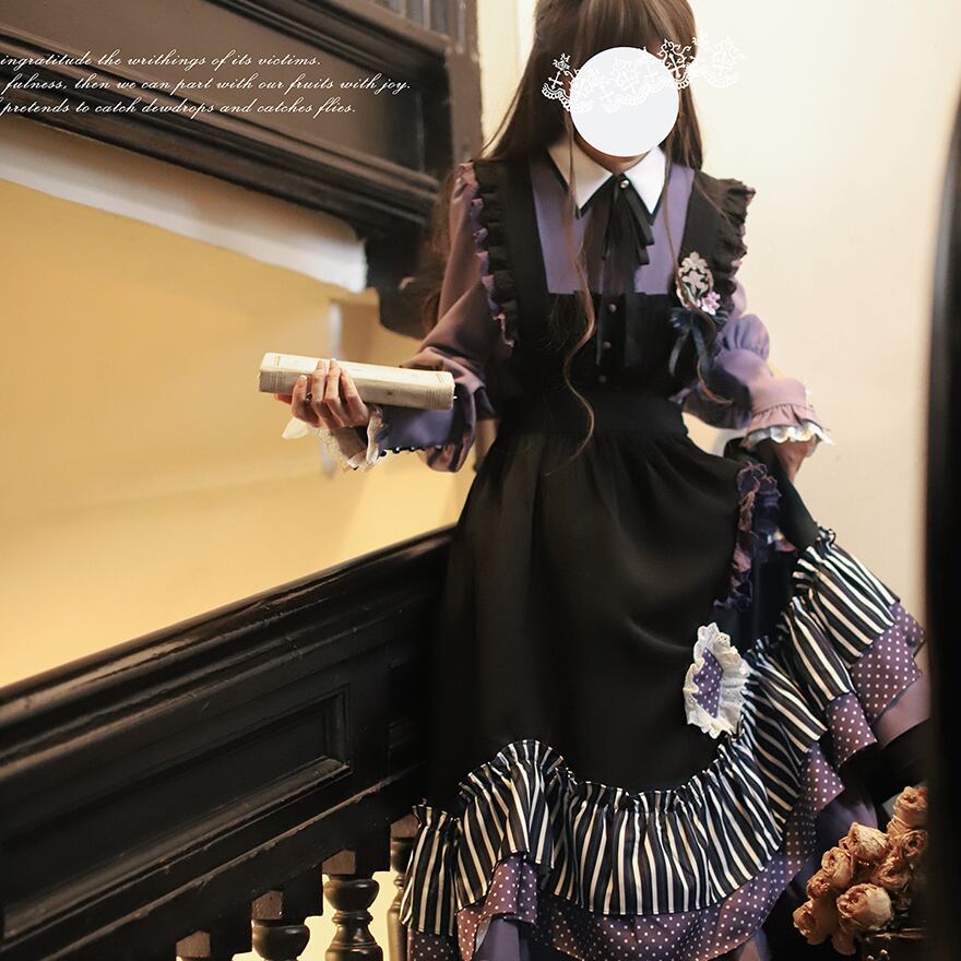 サブカル 服 地雷系 通販 クラロリ 魔女学院 ワンピース エプロン 重ね着 オーバースカート ストライプ メイド風 秋冬服 量産型 ガーリー