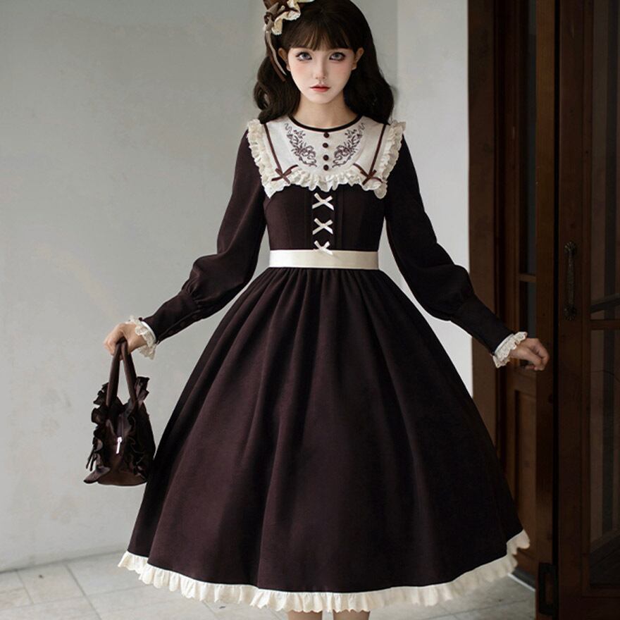 サブカル 服 地雷系 通販 PUJIオリジナル クラロリ ワンピース ショート丈 リボン付き 長袖 パフスリーブ ネックリボン 刺繍 秋冬服 量産型