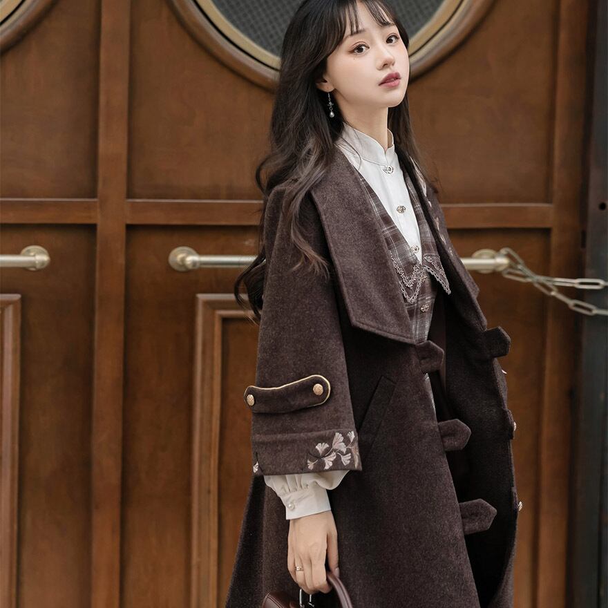 イチョウ刺繍が入ったウールコートがお洒落です。