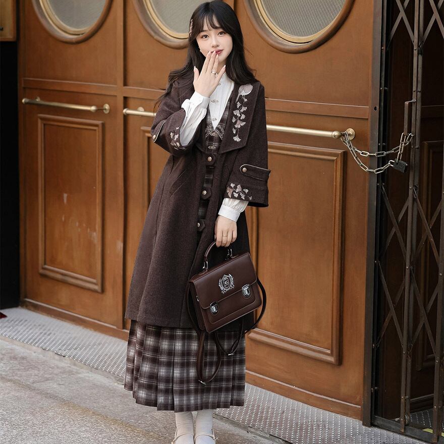 サブカル 服 地雷系 通販 クラロリ 森ガール 3点セット セットアップ コート アウター ワンピース 長袖シャツ スタンドカラー チェック柄 秋冬服 普段着使い 大人増し
