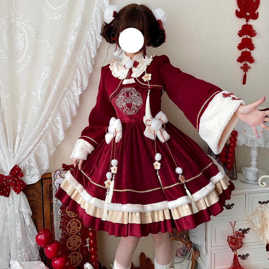 サブカル 服 地雷系 通販 チャイナ風 セットアップ 中華系ロリータ ツーピース ワンピース 上着 フレアスリーブ 中華風 クリスマス衣装 サンタクロース衣装 イベント パーティ衣装 コスプレ かわいい 量産型 ガーリー lolita