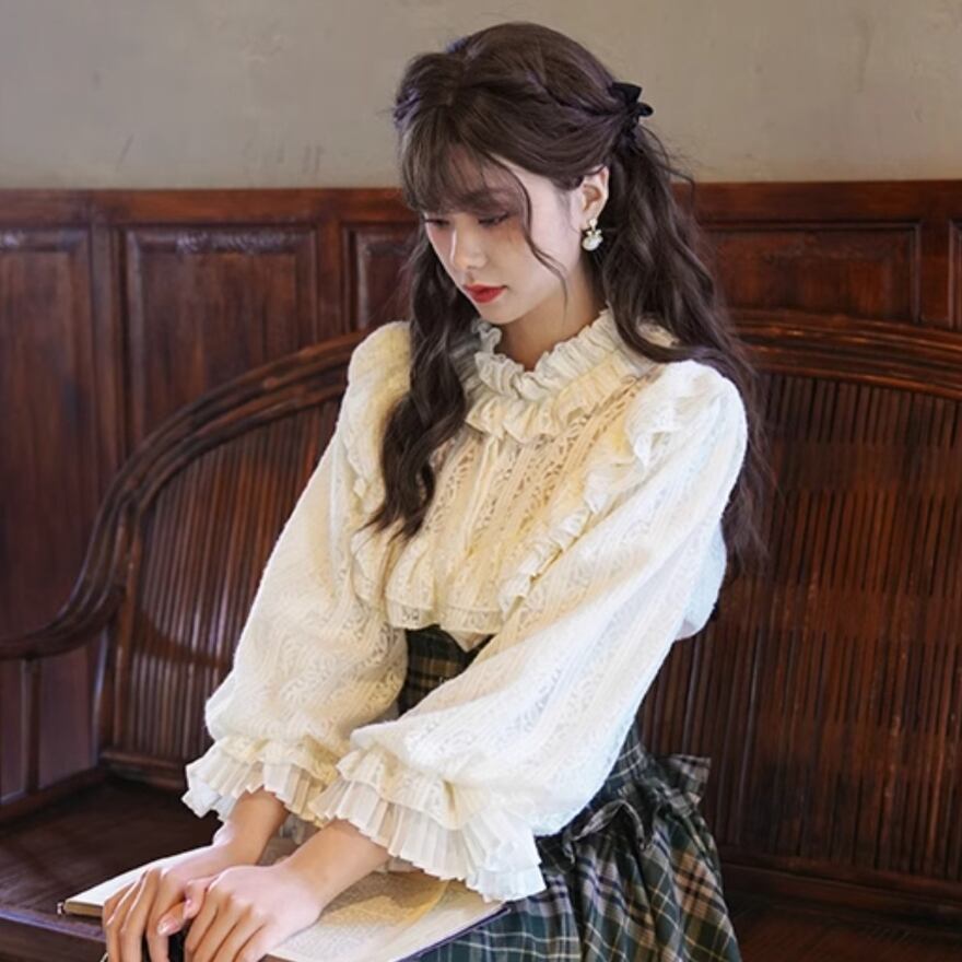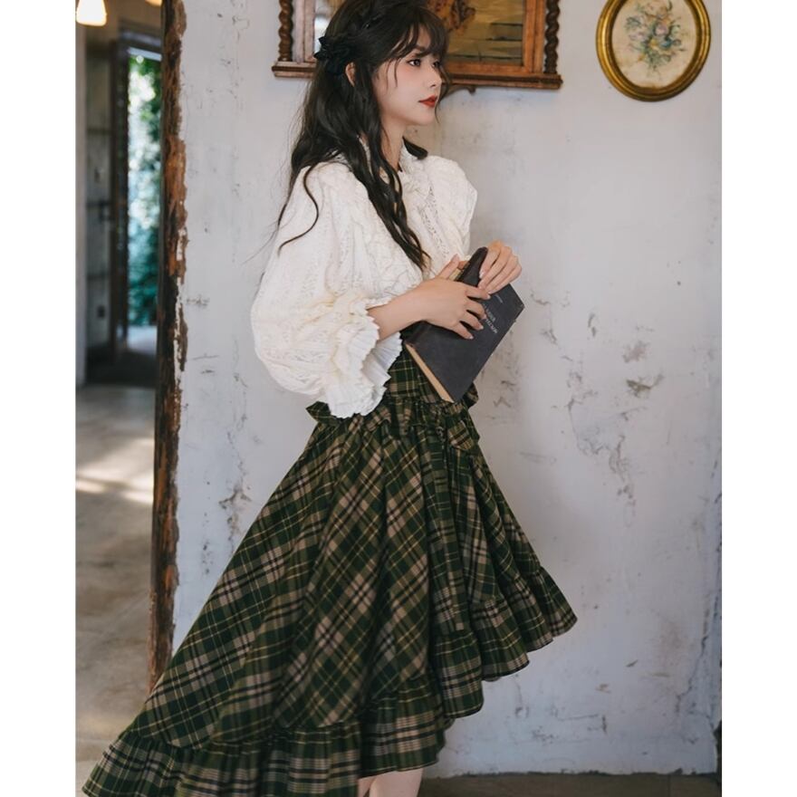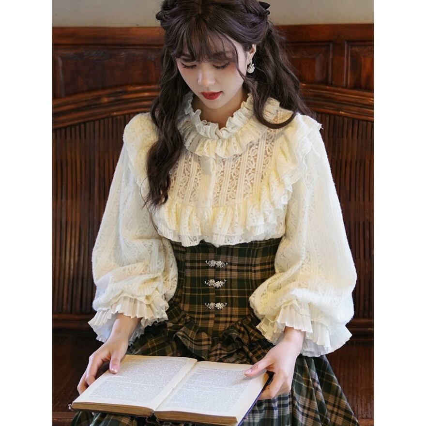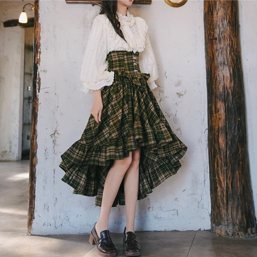 サブカル 服 地雷系 通販 ロリィタファッション クラロリ 上下セット セットアップ ブラウス スカート チェック柄 アシンメトリー レース ギャザー お嬢様コーデ 上品 控えめ