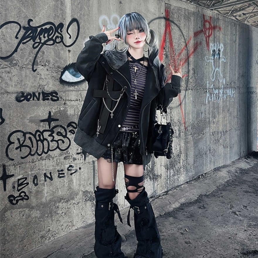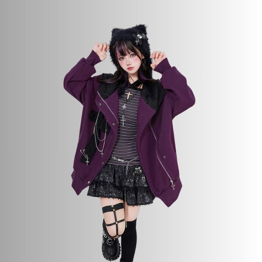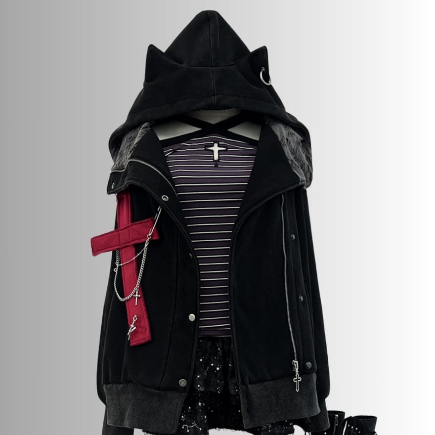 サブカル 服 地雷系 通販 パンク フーディ ジャケット クロス 十字 猫耳 フード チェーン 原宿スタイル 系女子