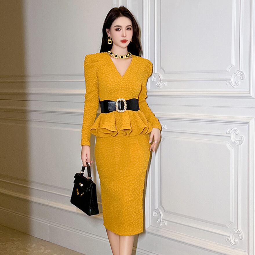 腰回りを上手にカバーするVネックの長袖ドレスと体にフィットするペンシルスカートです。