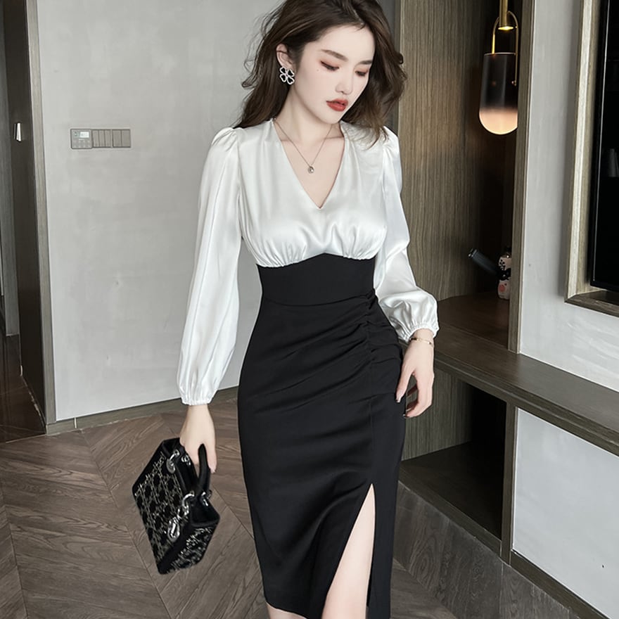 ブラックとホワイトの組み合わせのVネック長袖ドレスとセクシーなカットアウトペンシルスカートです。